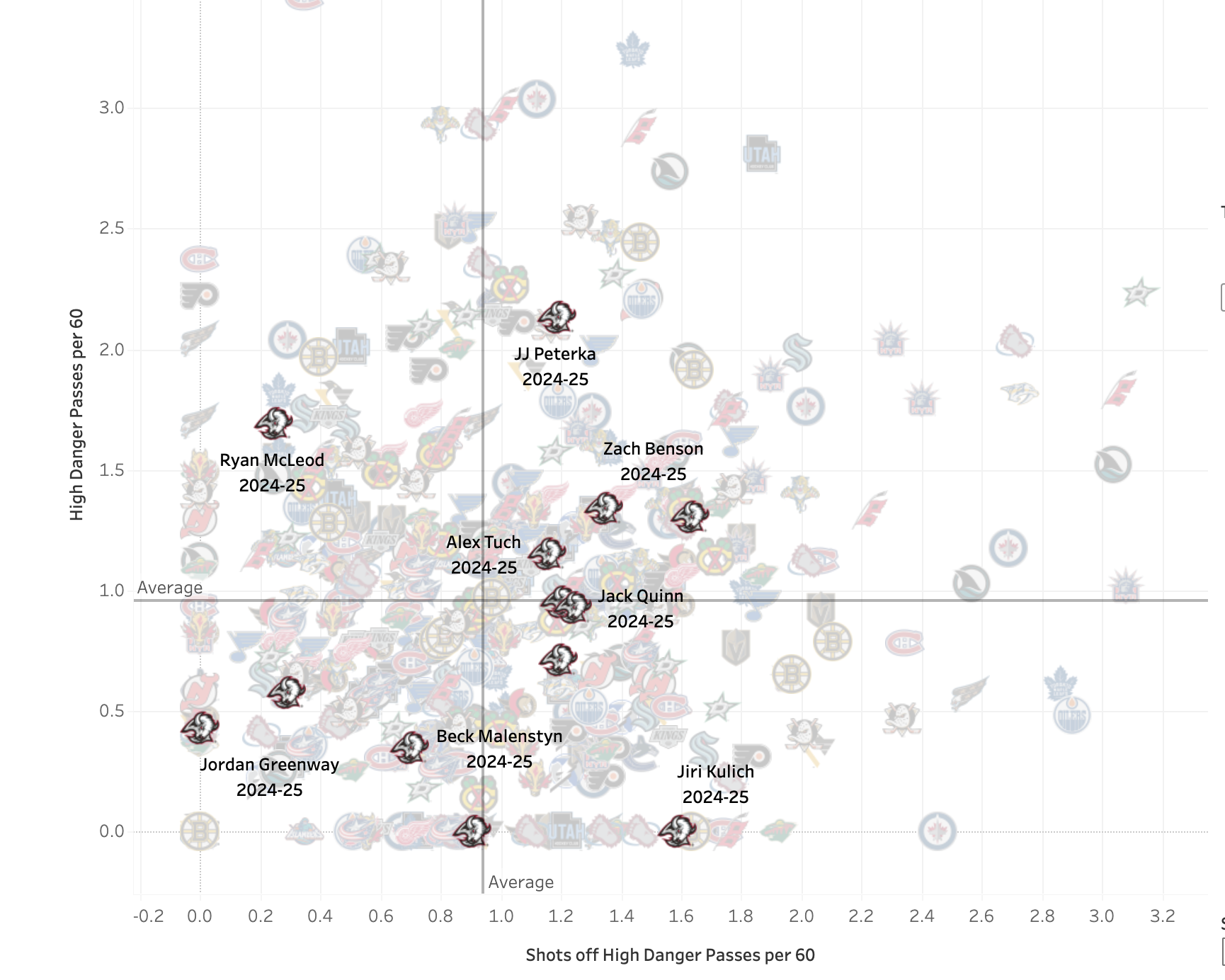 The only Hawk anywhere near Peterka on the High Danger Passes scale was...Pat Maroon? How did we watch this fucking team? Anyway, Peterka ranks just as highly if you downgrade to just setting up scoring chances.