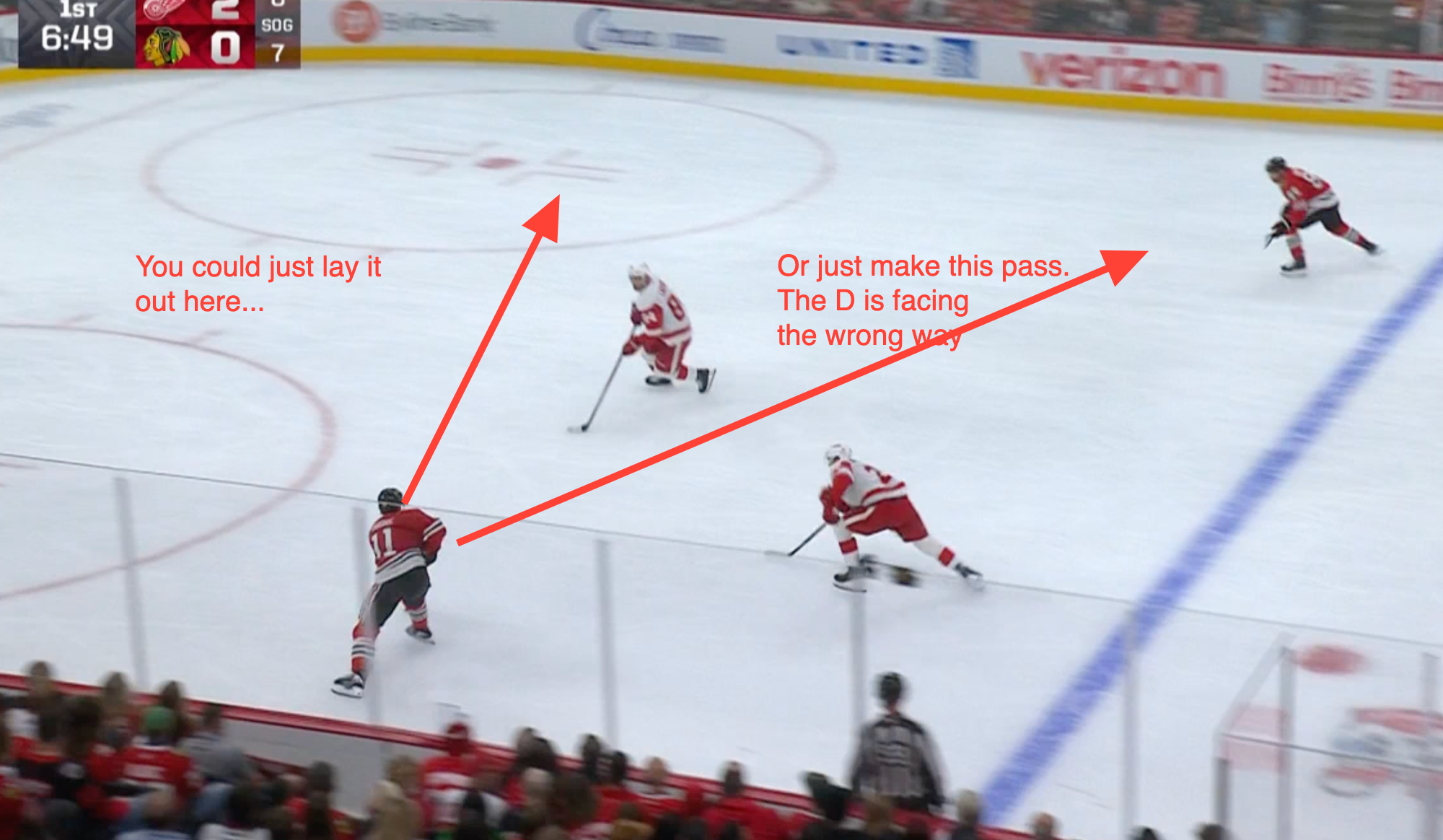 For the Wings first goal, Bedard turned the puck over at the offensive blue line, on a nice play from Arvid Fever's brother. Darren Pang, in his infinite wisdom on the broadcast, was bemoaning that Bedard didn't just dump the puck in and got his team caught.