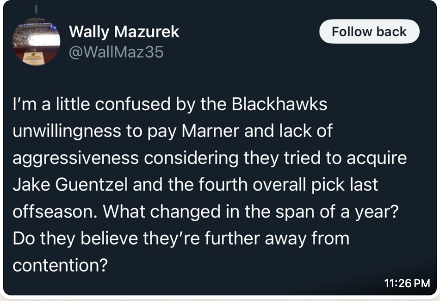 At this point, with the repeated leaks to everyone about how the Hawks are unsure of the fit with Marner (Marner fits with every team), this is clearly a dedicated message they want out there. As Wally points out above, this is in direct opposition to what they wanted out there last summer, when it was no secret how hard they chased Jake Guentzel, and ended up with Tyler Bertuzzi.