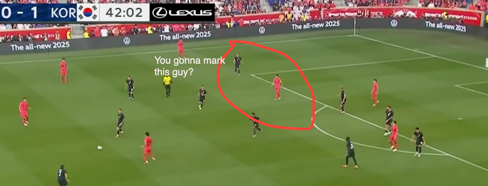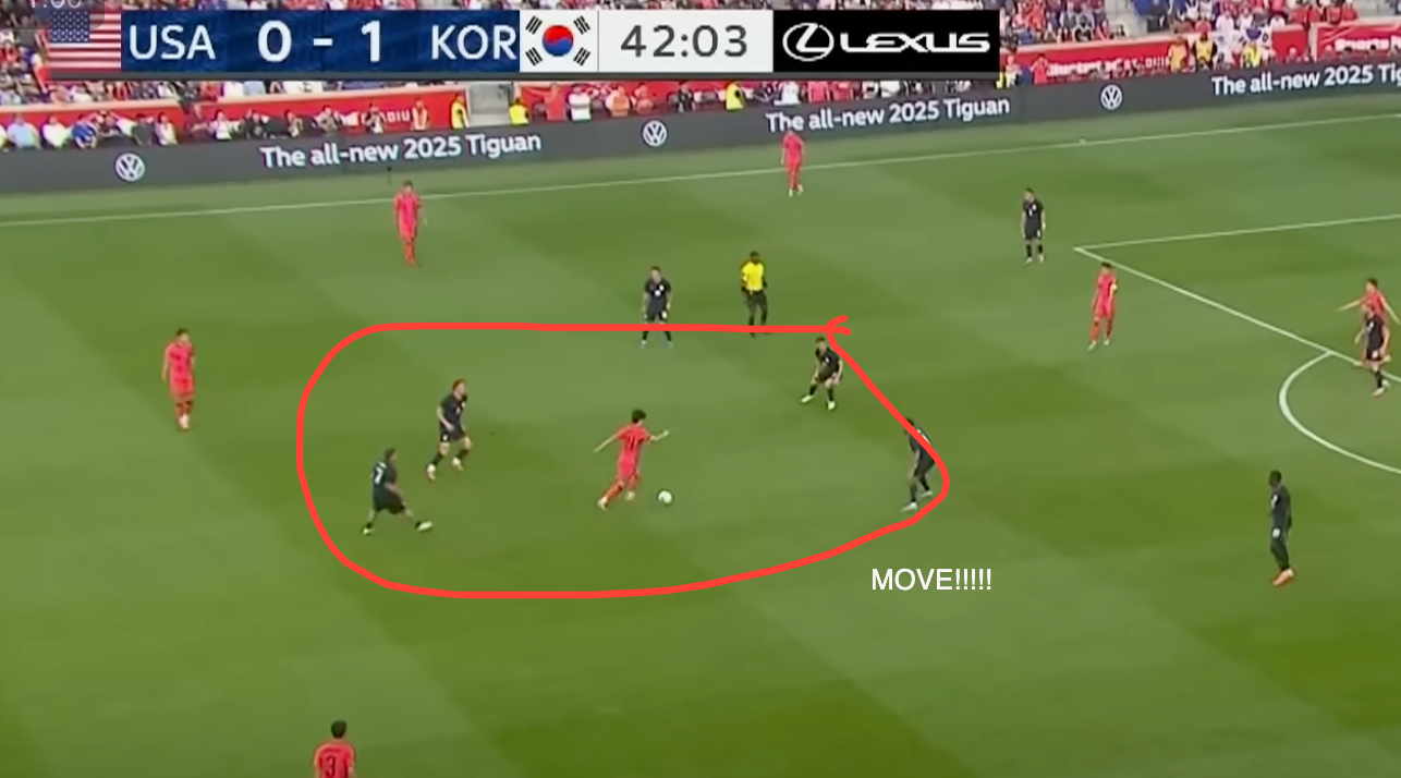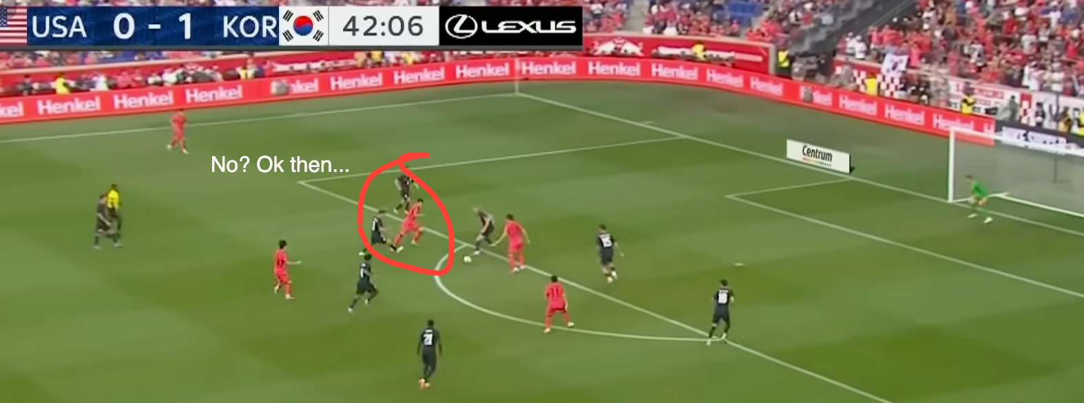 A tragic defensive showing in the USMNT's first half vs. 🇰🇷 Lack of coordination in press, mid & low-block. Here, Luna doesn't use his cover shadow to block access to opposing CM + Adams sprints wide to close WB when he should let Arfsten deal with it, leaving CM wide open.